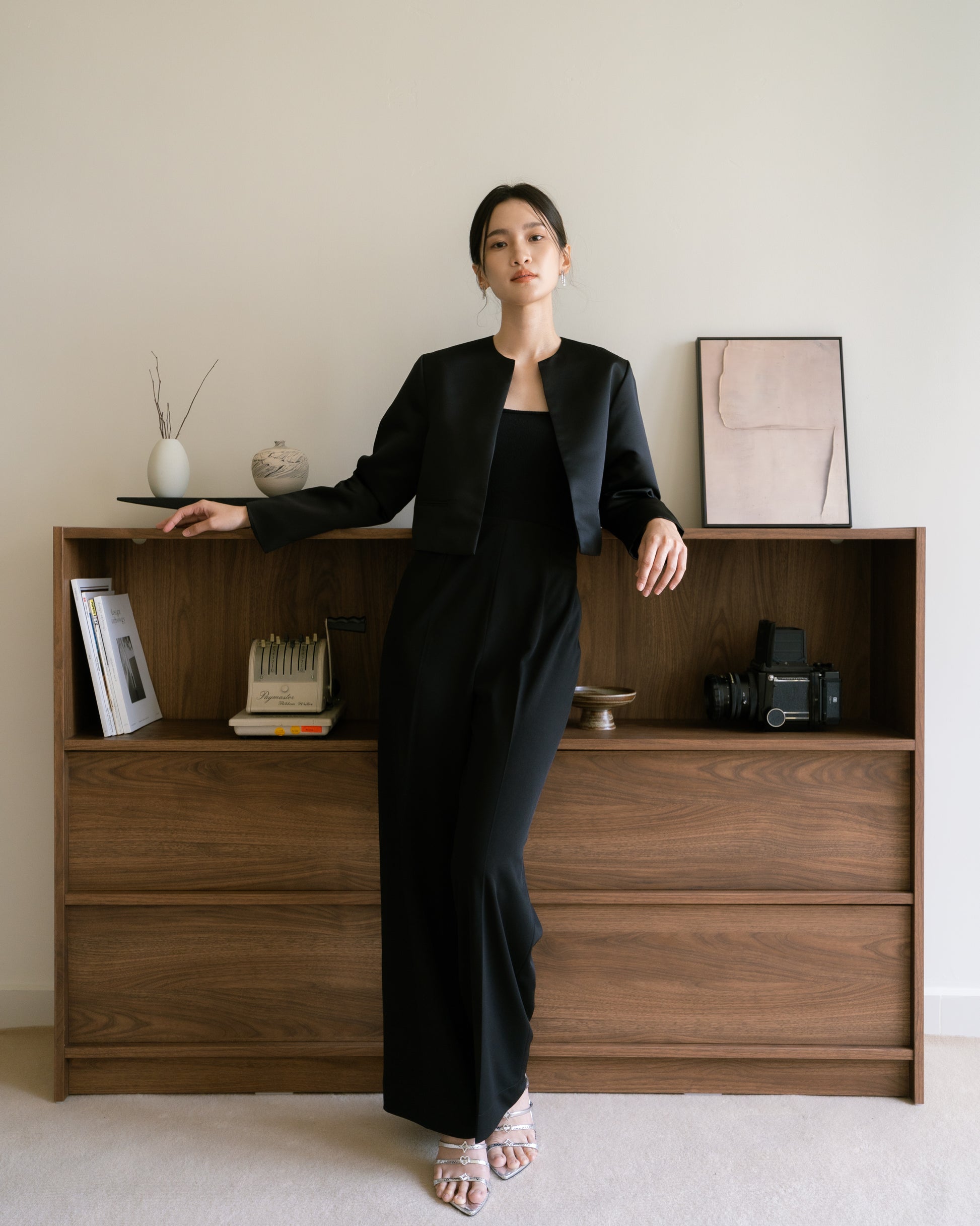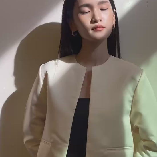 The Aria Cropped Satin Jacket is a collarless, tailored piece designed to add structure to your outfit without feeling overly formal. Featuring a sleek open front, full lining, and non-functional welt pockets, it offers just the right balance of simplicity and structure.