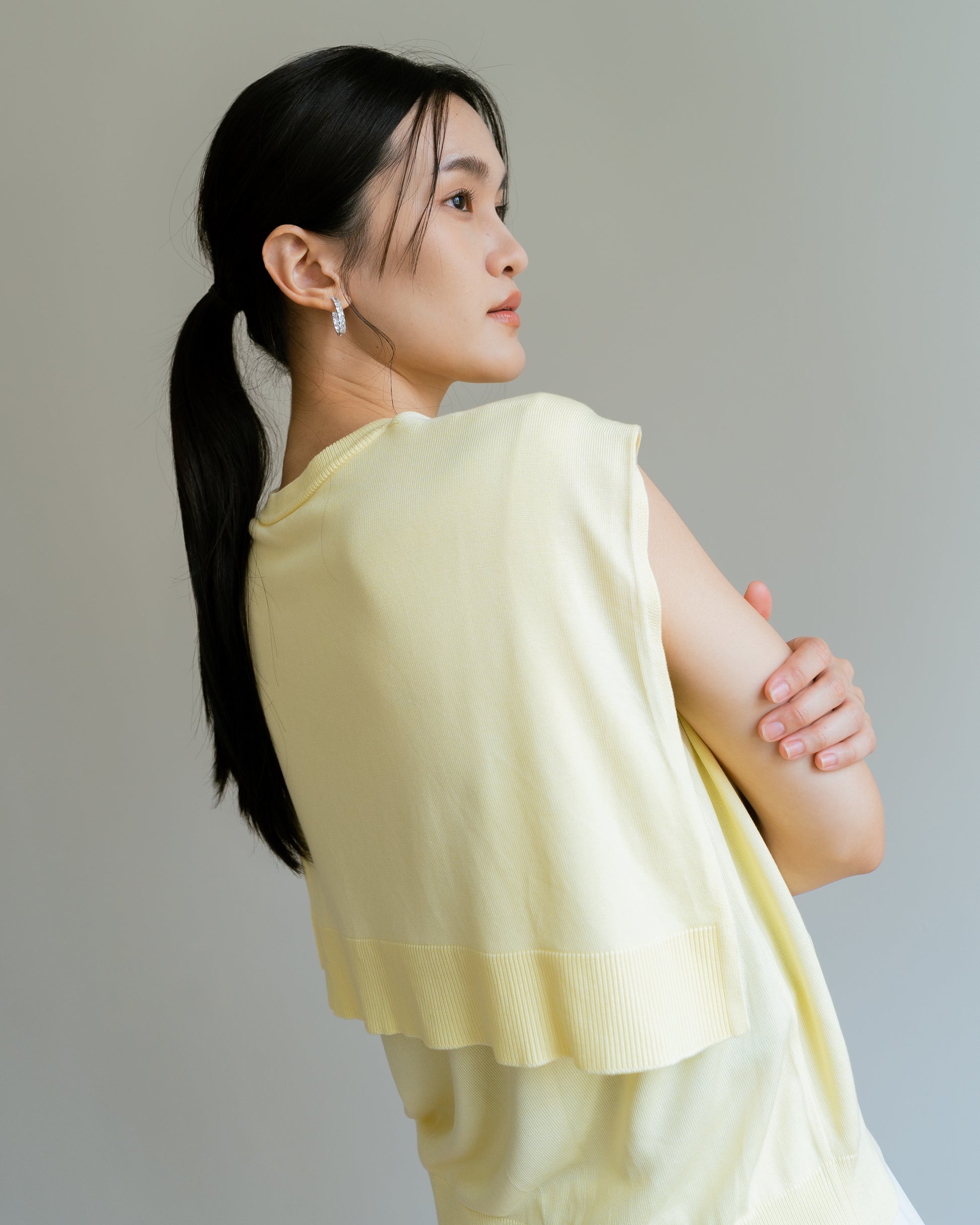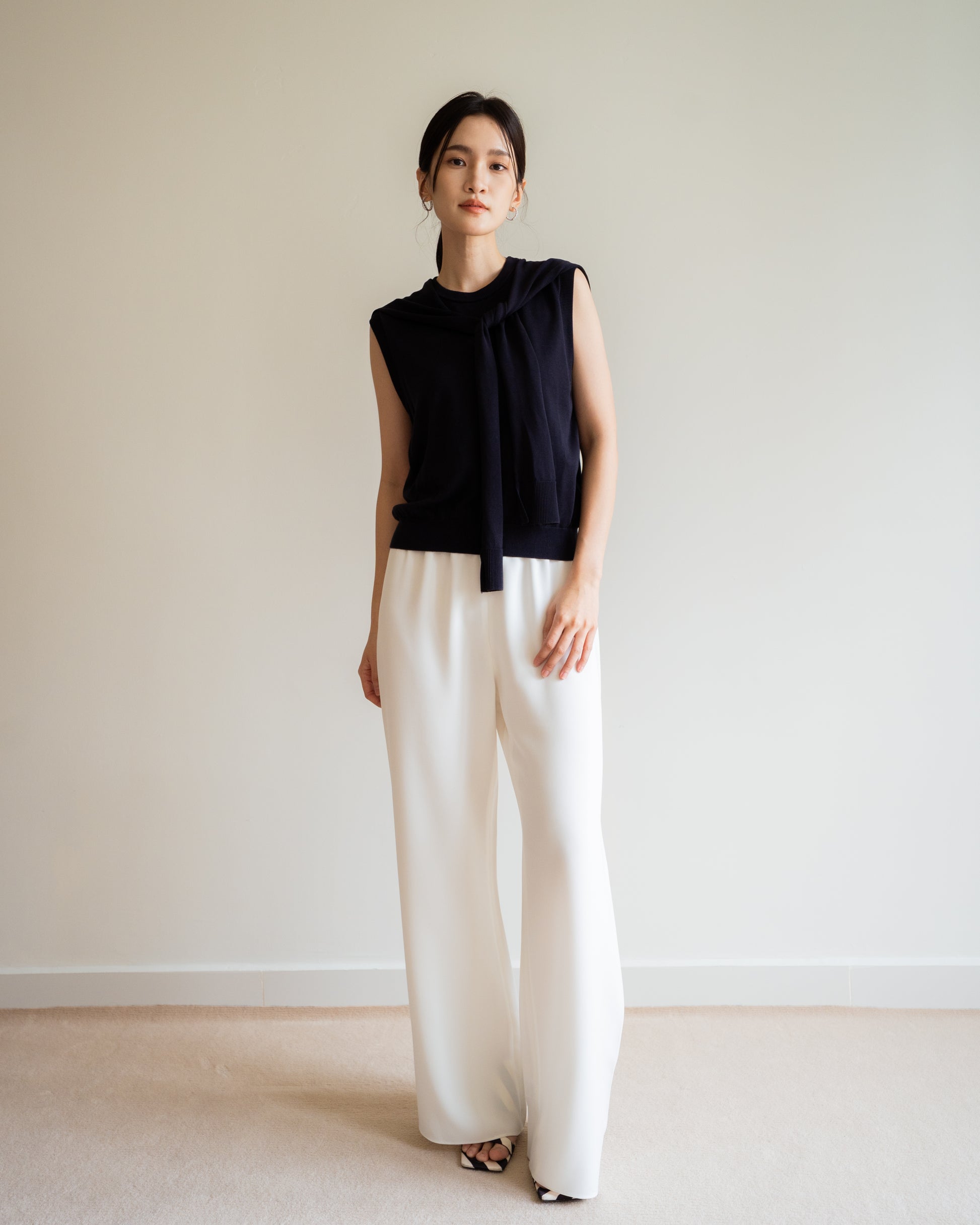 The Eloise Knit Scarf-Top is a sleeveless knit with an attached scarf detail that can be styled loose, tied, or draped to suit the occasion. It’s crafted from a lightweight knit fabric with a soft, breathable finish that feels easy on the skin.